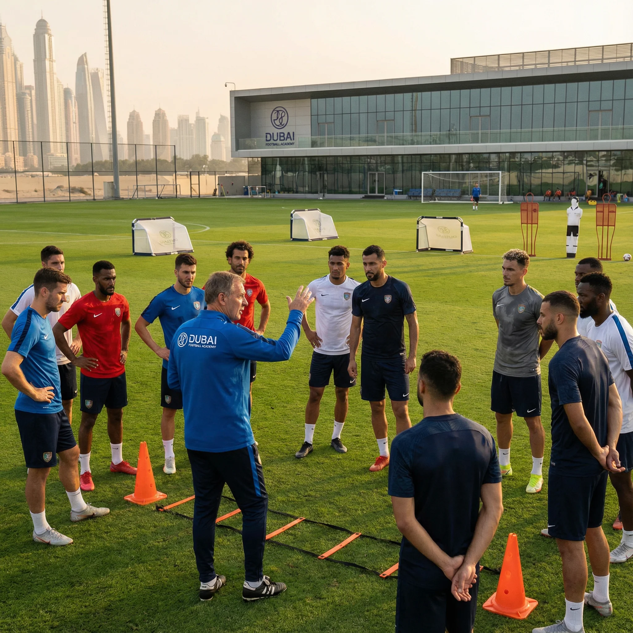 The Dubai Football Camp is a 1-week elite football training experience held in Dubai, designed for ambitious players from around the world who want to train at a high level, stay match-fit, and gain real exposure to the professional football environment in the UAE.
